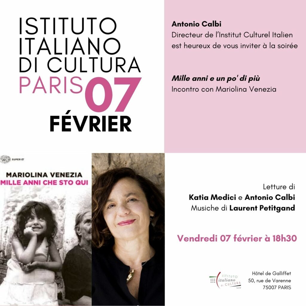 In occasione della sua residenza d’artista, il direttore Antonio Calbi avrà il piacere di incontrare la scrittrice Mariolina Venezia, vincitrice del Premio Campiello 2007 con il romanzo Mille anni che sto qui (Einaudi; edizione francese J’ai vécu mille ans, tr. fr. de Nathalie Bauer, Paris, Laffont). L’evento si svolgerà il 7 febbraio, alle ore 18.30, presso l’Istituto Italiano di Cultura di Parigi. Durante l’incontro, discuteranno del suo percorso di autrice trasversale, dai primi anni di formazione in Francia fino al successo dei romanzi polizieschi da cui è stata tratta la serie televisiva “Imma Tataranni: sostituto procuratore”. Nel corso della serata saranno letti alcuni brani da Katia Medici e Antonio Calbi. Previsti intermezzi musicali di Laurent Petitgand.