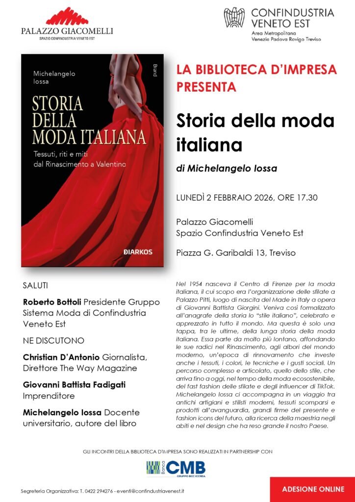 Lunedì 2 febbraio 2026, alle ore 17.30, il monumentale Palazzo Giacomelli – Spazio Confindustria Veneto Est (Piazza G. Garibaldi, 13) ospiterà la presentazione del volume “Storia della moda italiana. Tessuti, riti e miti dal Rinascimento a Valentino” (Diarkos Editore).