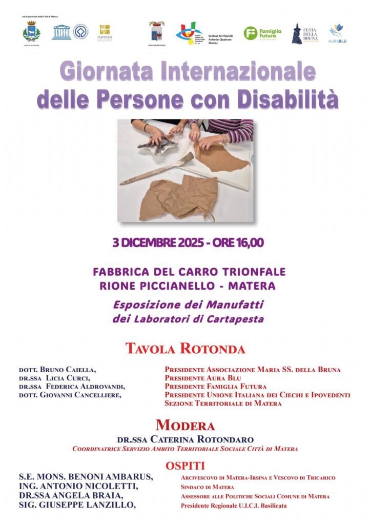 Ieri, in occasione della Giornata internazionale delle persone con disabilità, si è svolta la Tavola Rotonda conclusiva con le tre Associazioni insieme all’Associazione Maria SS. della Bruna, all’Assessore alle Politiche Sociali dell’Amministrazione del Comune di Matera dr.ssa Angela Braia, alla dr.ssa Caterina Rotondaro, responsabile del Servizio Sociale del Comune di Matera e a S.E. Arcivescovo di Matera-Irsina e Vescovo di Tricarico Mons. Benoni Ambarus.