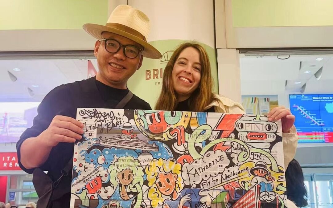 Il suo lavoro non si limita ai viaggi: anche durante le passeggiate quotidiane, le soste al bar, lo shopping o i momenti di pausa, Xie raccoglie borse di carta abbandonate e le trasforma in supporti creativi, immortalando così scene urbane, pensieri e sogni in forma di doodle.