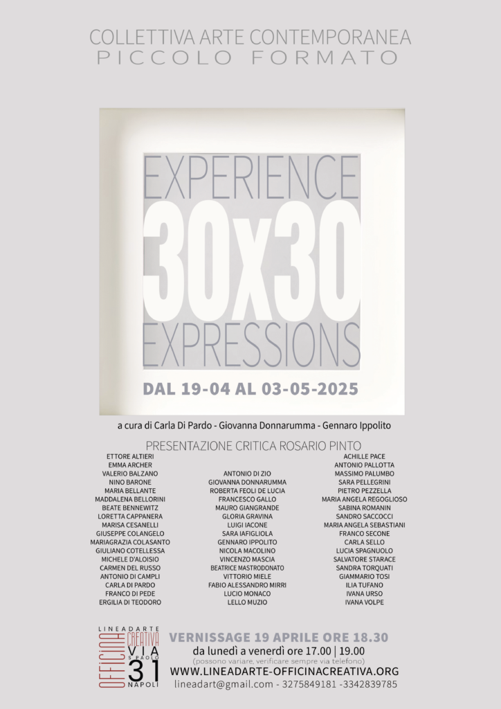 Il 19 aprile 2025 alle ore 18:30 si terrà l’inaugurazione della mostra collettiva “Experience 30×30 Expressions”, un’originale esposizione dedicata all’arte contemporanea di piccolo formato 30×30, presso lo Spazio Espositivo di LineaDarte-Officina Creativa a cura di Carla Di Pardo, Giovanna Donnarumma e Gennaro Ippolito.