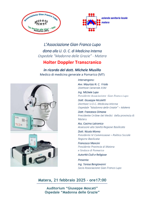 Venerdì 21 febbraio 2025, alle ore 17:00 nell’Auditorium “Giuseppe Moscati” dell’Ospedale Madonna delle Grazie di Matera ci sarà la donazione, da parte dell’Associazione Gian Franco Lupo, di un Holter Doppler Transcranico – del valore complessivo di 32.940,00 € – all’UOC – Unità Operativa Complessa di Medicina Generale diretta da Giuseppe Nicoletti.