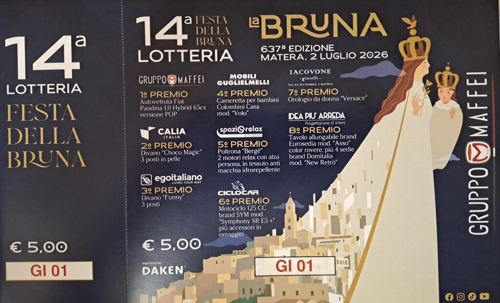 Tutte le matrici dei biglietti venduti parteciperanno all’estrazione finale di sabato 4 luglio 2026 alle ore 20:00 (l’estrazione dei premi minori avverrà alle 19) in Piazza Vittorio Veneto a Matera.