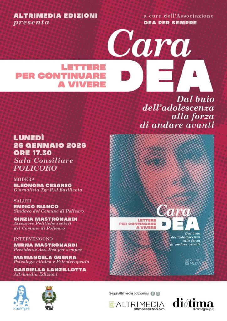 Lunedì 26 gennaio Altrimedia Edizioni presenta, con il patrocinio del Comune di Policoro e in collaborazione con l’associazione “Dea per sempre”, alle ore 17.30 presso la Sala consiliare dell’Amministrazione comunale, Cara Dea. Lettere per continuare a vivere. Dal buio dell’adolescenza alla forza di andare avanti, l’antologia curata dall’associazione “Dea per sempre”, fondata da Mirna Mastronardi, mamma di Dea, vittima di suicidio il 4 ottobre 2024.