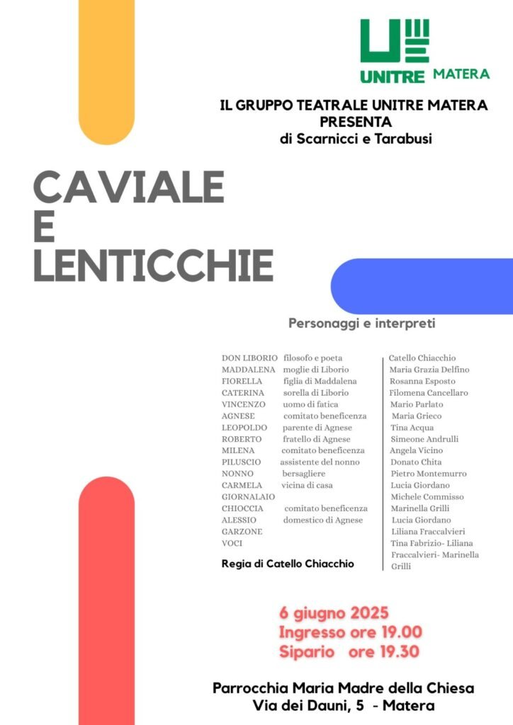 Venerdì 6 giugno, nell’Auditorium della parrocchia Maria Madre della Chiesa, con ingresso alle ore 19.00 e sipario alle ore 19.30, l’UNITRE di Matera presenta, a conclusione del corso di Teatro condotto dal professor Lello Chiacchio, “Caviale e Lenticchie”, di Scarnicci e Tarabusi”. Gli iscritti al Laboratorio teatrale nell’Anno Accademico 2024/25, appena concluso, dopo aver approfondito, anche nel corso degli anni precedenti, argomenti riguardanti la recitazione: dalla ortoepia, alla prosodia, dallo studio del testo all’analisi del personaggio, hanno dedicato il loro impegno alla messa in scena di un’intera commedia dei suddetti due autori fiorentini ambientata negli anni Cinquanta del secolo scorso. Vi aspettiamo numerosi per divertirci insieme e gustare le intricate e tragicomiche vicende della famiglia Lamanna, una famiglia davvero particolare e alquanto pittoresca.