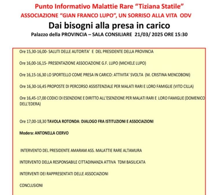 “Dai bisogni alla presa in carico” è il tema del convegno organizzato dall’Azienda Sanitaria Locale di Matera in collaborazione con l’Associazione “Gian Franco Lupo” che si svolgerà nella Sala Consiliare della Provincia, venerdì 21 marzo, a partire dalle ore 15,30. Obiettivo del convegno è quello di analizzare le principali criticità che le persone affette da malattie rare incontrano dopo la diagnosi e di proporre soluzioni per un percorso strutturato ed efficace di presa in carico.
