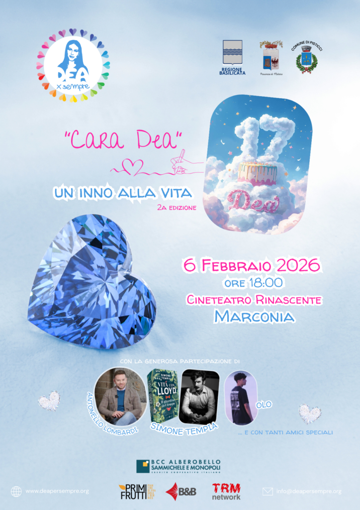 È tutto pronto per la seconda edizione di “Cara Dea – Un inno alla VITA”, la manifestazione annuale più importante dell’associazione Dea per sempre, in programma a Marconia la sera del 6 febbraio, giorno del compleanno di Dea, la giovane di Tinchi di Pisticci la cui storia ha dato origine all’impegno dell’odv.