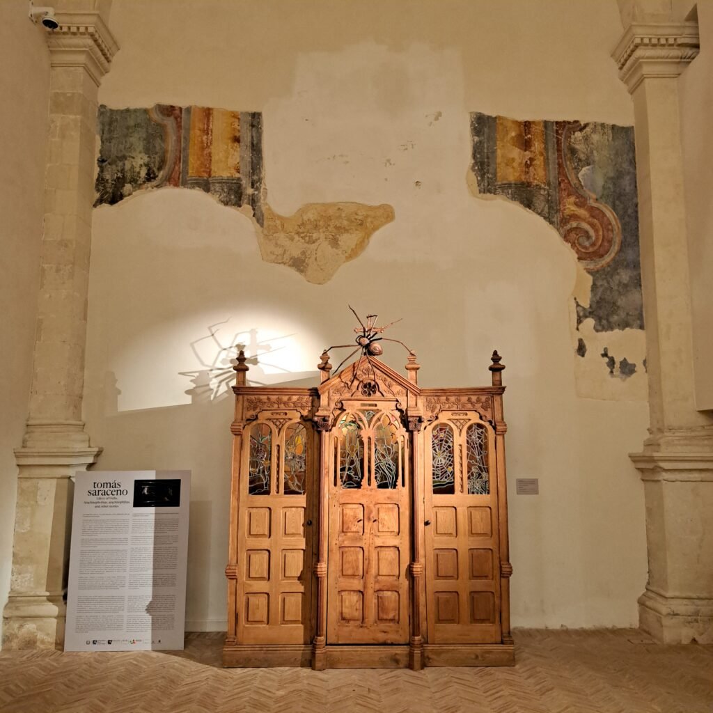 La scelta della Chiesa del Cristo Flagellato va in continuità con la collocazione precedente , trattandosi di uno spazio in origine utilizzato come luogo di culto, che ben si presta a dialogare con l’opera immaginata da Saraceno per Matera, un confessionale laico al cui interno è presente una ragnatela tessuta da ragni di diverse specie. Un invito per l’essere umano a condividere la saggezza ancestrale dei ragni e a mettere in discussione il proprio rapporto con la natura.