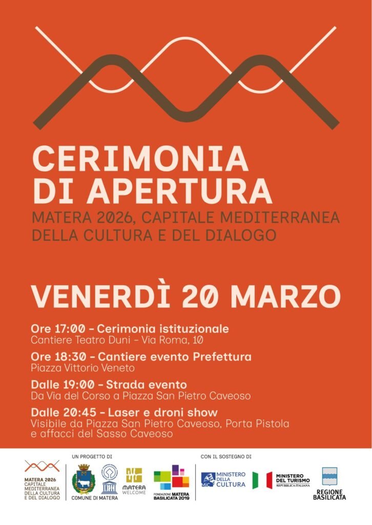 Si arricchisce di nuovi dettagli il programma della Cerimonia inaugurale di Matera Capitale Mediterranea della Cultura e del Dialogo 2026, in programma il 20 marzo in coincidenza con la Giornata Internazionale della Felicità. L’evento si articola in quattro momenti, dal centro della città fino al cuore antico dei rioni Sassi.