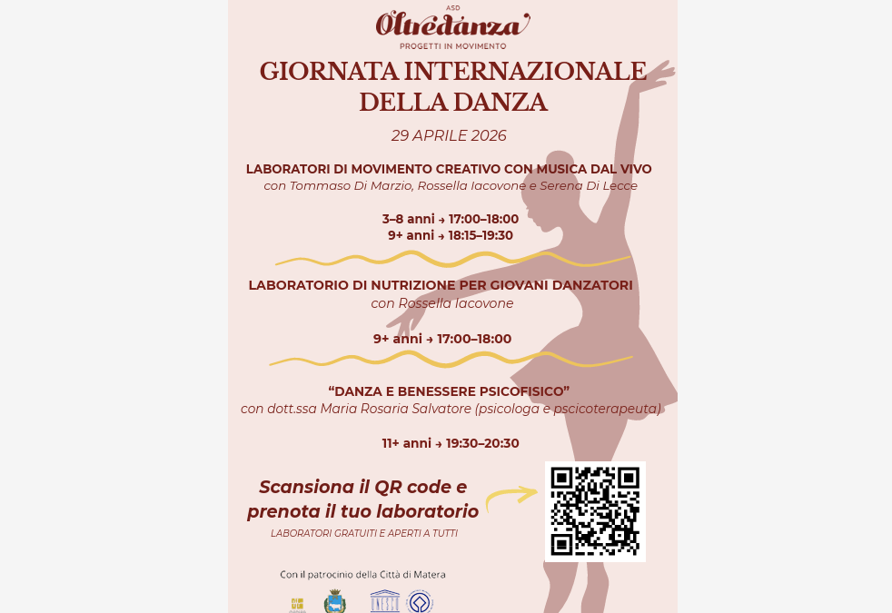 In occasione della Giornata Internazionale della Danza, celebrata il 29 aprile, l’ASD Oltredanzapromuove a Matera un articolato programma di attività dedicate al movimento, all’espressione corporea e al benessere psicofisico, rivolte a un pubblico ampio ed eterogeneo.
