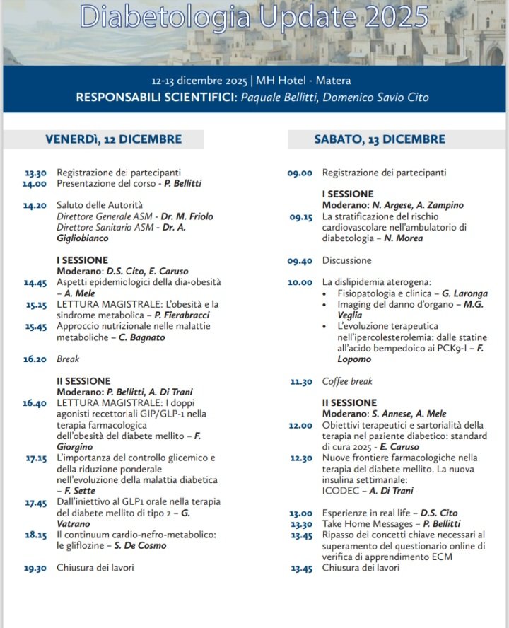 Il 12 e 13 dicembre all’MH Hotel di Matera si terrà il convegno “Diabetologia Update 2025” patrocinato dall’Azienda Sanitaria Locale di Matera (ASM), sarà possibile registrarsi dalle ore 13.30.