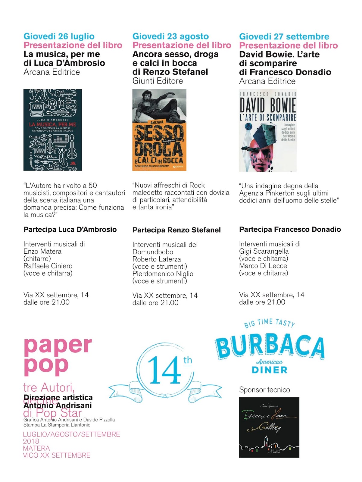 Organizzata da Burbaca e The14th con la direzione artistica di Antonio Andrisani, Paper Pop si articola in tre incontri – tutti con inizio alle 21 – che si terranno al numero civico14 di vico XX Settembre.