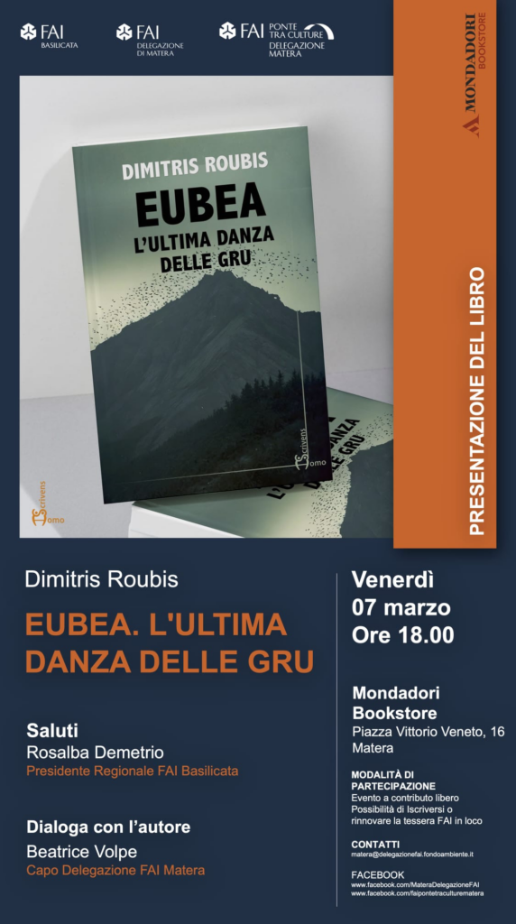 La Delegazione FAI di Matera vi dà appuntamento il 7 marzo, alle ore 18.00, nel Mondadori Bookstore, in piazza Vittorio Veneto 16 per la presentazione del romanzo “Eubea, l’ultima danza delle gru”, ispirato a eventi accaduti nel 1944, tra le montagne dell’Eubea centrale, durante il periodo dell’occupazione nazista in Grecia.
