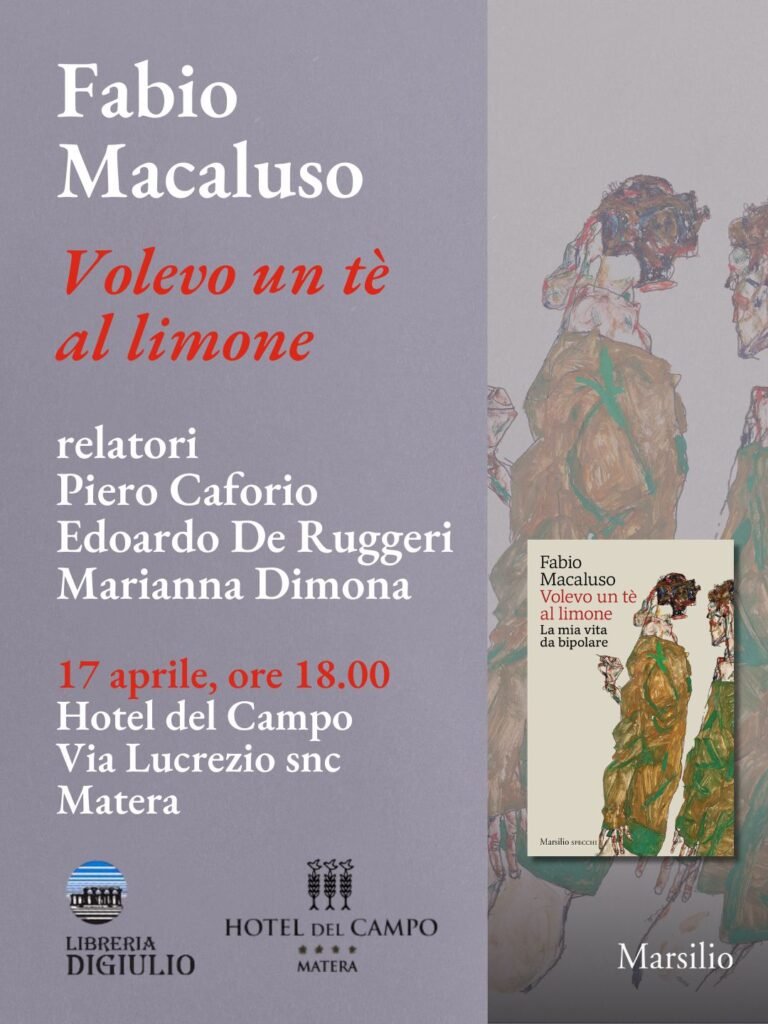 «Cosa significa avere una famiglia, un bel lavoro, e perdere ogni cosa per colpa di una malattia mentale? Volevo un tè al limone di Fabio Macaluso è uno straordinario e originale memoir che racconta le vicende di un uomo che crolla in una depressione devastante e scopre così di essere affetto da bipolarismo. La stessa condizione che, nei momenti di euforia, gli aveva permesso di essere un avvocato abilissimo, un compagno affettuoso e un amico istrionico, energico e incredibilmente vitale, mostra di colpo l’altra faccia della medaglia: una depressione profonda, cupa e inabilitante, un male oscuro che travolge la vita del protagonista e delle persone che gli sono accanto.