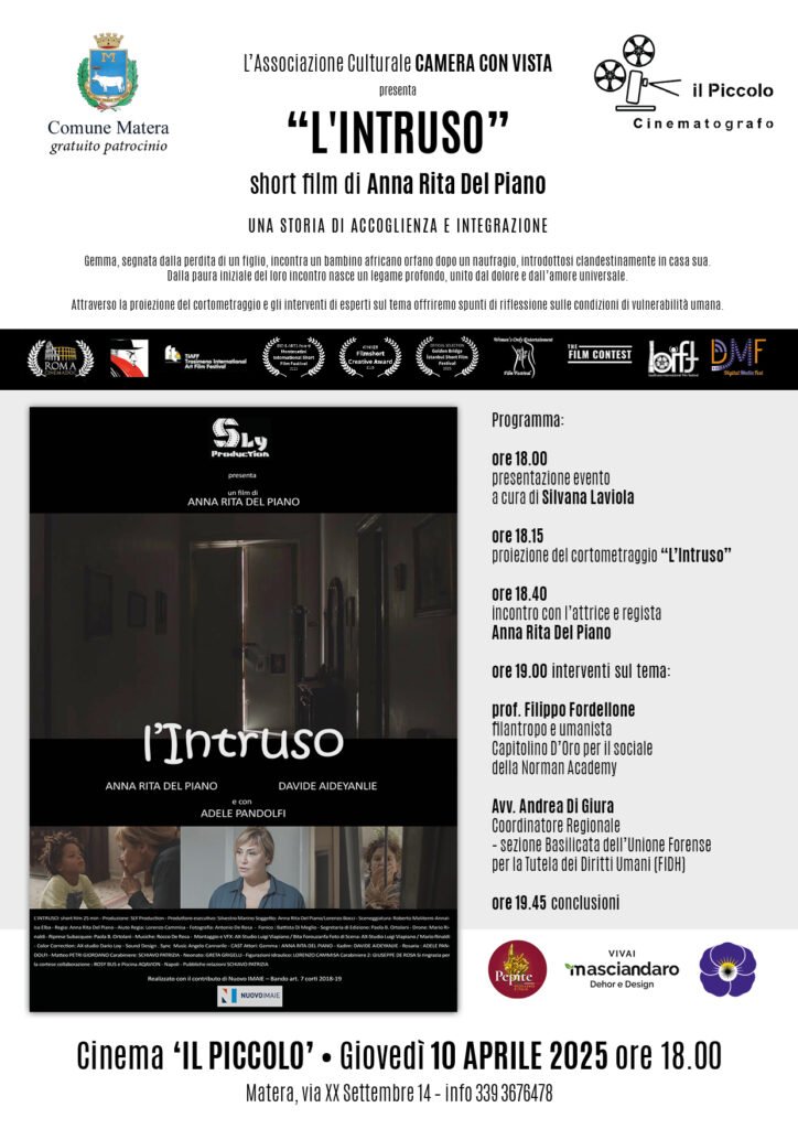 L’Associazione Culturale “Camera con Vista” è lieta di presentare L’Intruso, cortometraggio dell’attrice e regista Anna Rita Del Piano, un’opera che affronta con sensibilità e profondità il tema dell’accoglienza e dell’integrazione in contesti di vulnerabilità umana.
