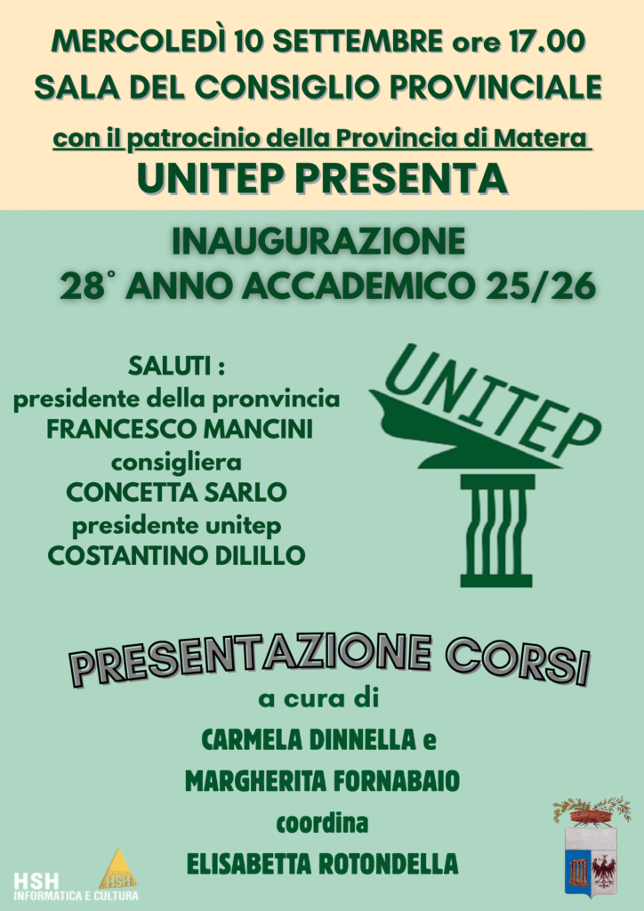Mercoledì 10 settembre 2025 alle ore 17:00 con il patrocinio della Provincia di Matera si terrà l’inaugurazione del 28° anno accademico dell’UNITEP, Università della Terza Età e dell’Educazione Permanente di Matera.