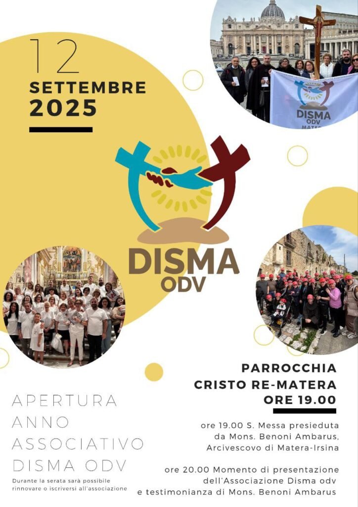 Con un appuntamento pubblico di forte intensità spirituale e civile, l’associazione di volontariato penitenziario Disma inaugura il nuovo anno associativo venerdì 12 settembre, presso la Parrocchia Cristo Re di Matera.