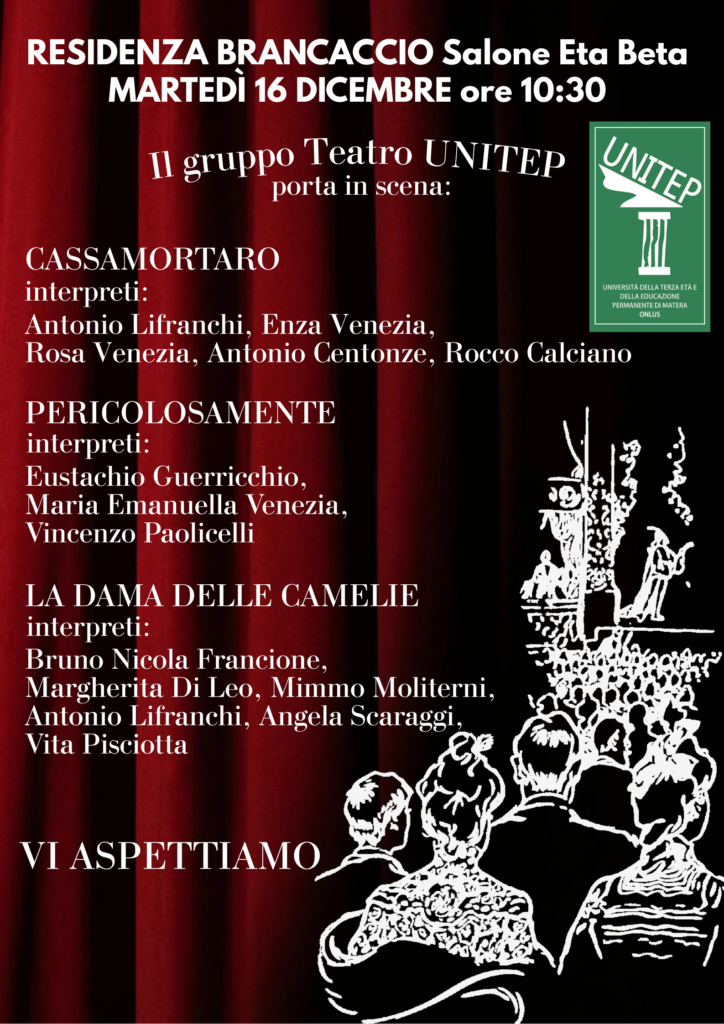 Martedì 16 dicembre 2025 alle ore 10,30 nel salone ‘Eta Beta’ della Residenza Brancaccio di Matera è in programma uno spettacolo del gruppo teatro Unitep diretto da Bruno Francione.