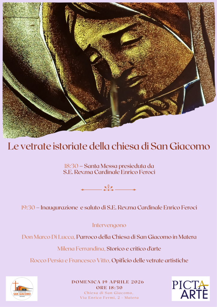 Domenica 19 aprile 2026, la Chiesa di San Giacomo di Matera vivrà un momento di particolare rilievo spirituale, artistico e comunitario con l’inaugurazione delle nuove vetrate istoriate, un importante intervento che coniuga arte sacra, architettura contemporanea e profonda ispirazione religiosa. La serata avrà inizio alle ore 18:30 con la Santa Messa, presieduta da S. Em.za Rev.ma Cardinale Enrico Feroci, la cui presenza nella Chiesa di San Giacomo è prevista proprio in occasione di questo significativo appuntamento. A seguire, alle ore 19:30, sarà lo stesso Cardinale Enrico Feroci a inaugurare ufficialmente le nuove vetrate artistiche suggellando, con la sua presenza e il suo intervento, un evento di grande valore simbolico e culturale per la comunità parrocchiale e per la città di Matera. L’inaugurazione sarà accompagnata dagli interventi di Don Marco Di Lucca, parroco della Chiesa di San Giacomo, della storica dell’arte Milena Ferrandina e degli artisti Rocco Persia e Francesco Vitto dell’Opificio Picta Arte, protagonisti della realizzazione delle opere.