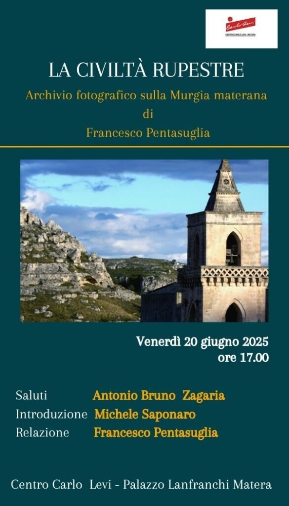 Venerdì 20 giugno, nella sede del Centro Levi, alle ore 17.00, Francesco Pentasuglia, storico, fotografo e studioso della civiltà rupestre materana, presenterà il suo archivio fotografico. Le foto contengono testimonianza di luoghi del nostro splendido patrimonio rupestre, alcune mostrano siti crollati e ormai scomparsi, per incuria e abbandono. Un patrimonio inestimabile che va salvaguardato. Francesco Pentasuglia è nato a Matera nel 1955. Laureato in Storia Moderna presso l’Università degli studi di Bologna, ha lavorato presso il Ministero dei Beni culturali come fotografo e archivista di Stato. E’ autore di numerose pubblicazioni sulla religiosità popolare e sulla Murgia Materana e di otto mostre fotografiche sugli aspetti sociali e religiosi del territorio. Con questo incontro, che prevede anche l’intervento di Michele Saponaro, il Centro Carlo Levi di Matera vuole continuare la sua opera di sensibilizzazione per la conservazione del patrimonio paesaggistico, storico, religioso e naturale che da anni sta portando avanti. È importante conoscere il valore della civiltà rupestre per poterla salvaguardare e proteggere dalla invadente presenza di attività umane finalizzate solo a generare lucro e che non sempre rispettano i delicati equilibri necessari a mantenere in vita un patrimonio unico al mondo.