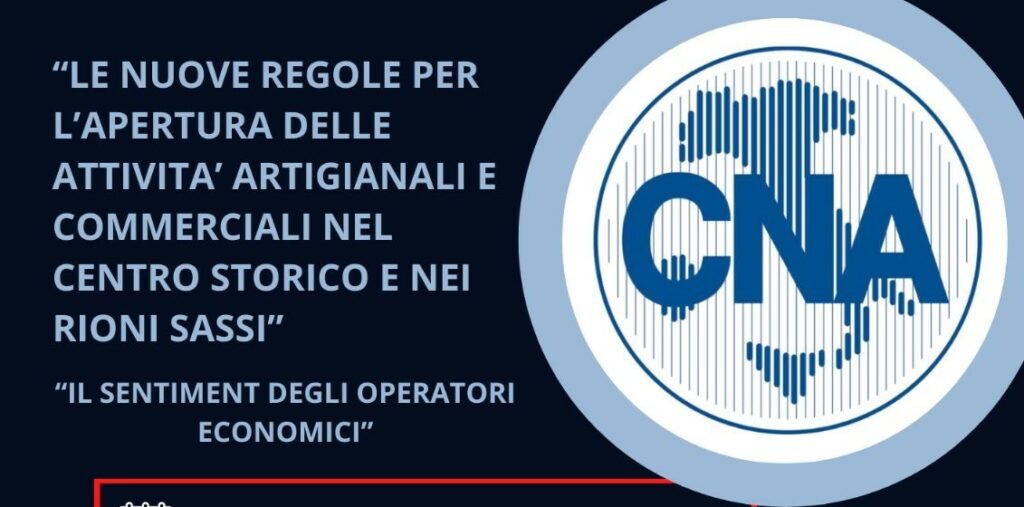 Si terrà lunedì 20 febbraio 2023 con inizio alle ore 18.30 nella sala riunioni della Cna in Via degli Aragonesi 26/a a Matera, il seminario organizzato dalla Cna dal titolo “Le nuove regole per l’apertura delle attività artigianali e commerciali nel centro storico e nei rioni sassi – Il Sentiment degli operatori economici”.