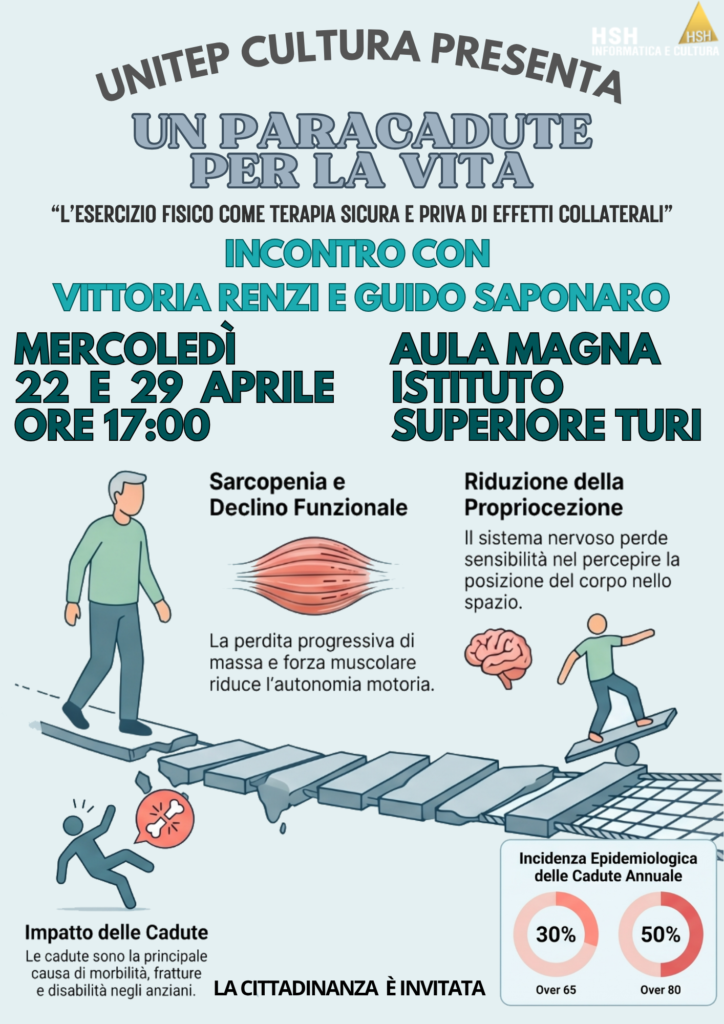 Mercoledì 22 aprile 2026 alle ore 17.00 nell’Aula Magna dell’Istituto Alberghiero “Turi” di Matera, nell’ambito dei Mercoledì di Unitep Cultura, è in programma il primo incontro con il Dott. Guido Saponaro e la Prof.ssa Vittoria Renzi sul tema dell’attività motoria per gli over 60. La conferenza, dal titolo “Un Paracadute per la Vita ‘L’esercizio fisico come terapia indispensabile, multifunzione, sicura, priva di effetti collaterali’, si articolerà in due appuntamenti che avranno luogo il 22 ed il 29 aprile 2026 nella stessa sede dell’Istituto Alberghiero e si concentrerà sugli aspetti medici delle cadute, causa soprattutto della perdita di autonomia nella popolazione anziana e di come l’attività motoria possa rappresentare uno strumento di prevenzione nel rischio di cadute.