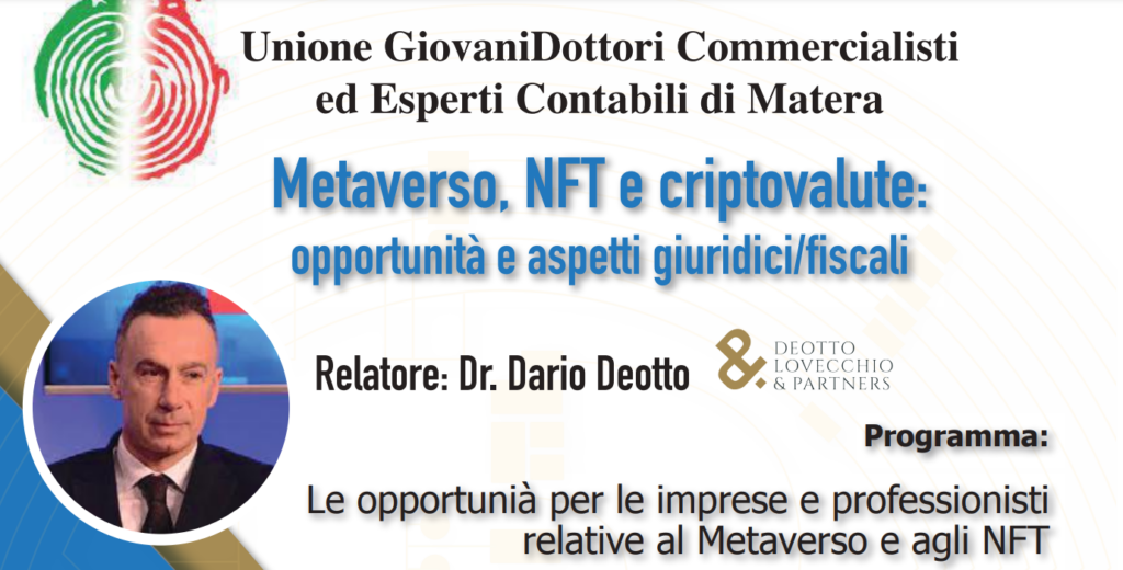 Nell’ambito degli eventi formativi per i Dottori Commercialisti, l’Unione Giovani Dottori Commercialisti di Matera, con il patrocinio della sezione locale, ha organizzato un convegno di straordinaria attualità dal titolo “Metaverso, NFT e criptovalute: opportunità e aspetti giuridico-fiscali”.