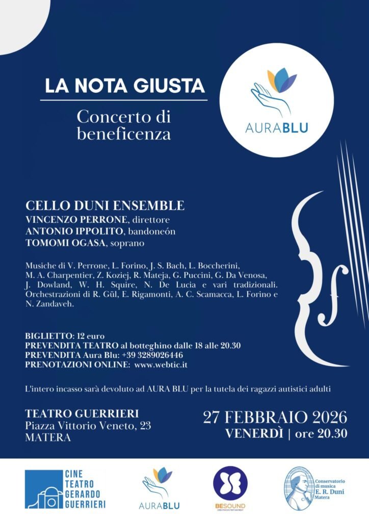 Venerdì 27 febbraio al Teatro Guerrieri di Matera alle 20.30 si svolgerà il concerto di beneficenza “La nota giusta” a sostegno di Aura Blu (Associazione di famiglie per la tutela dei ragazzi autistici adulti).