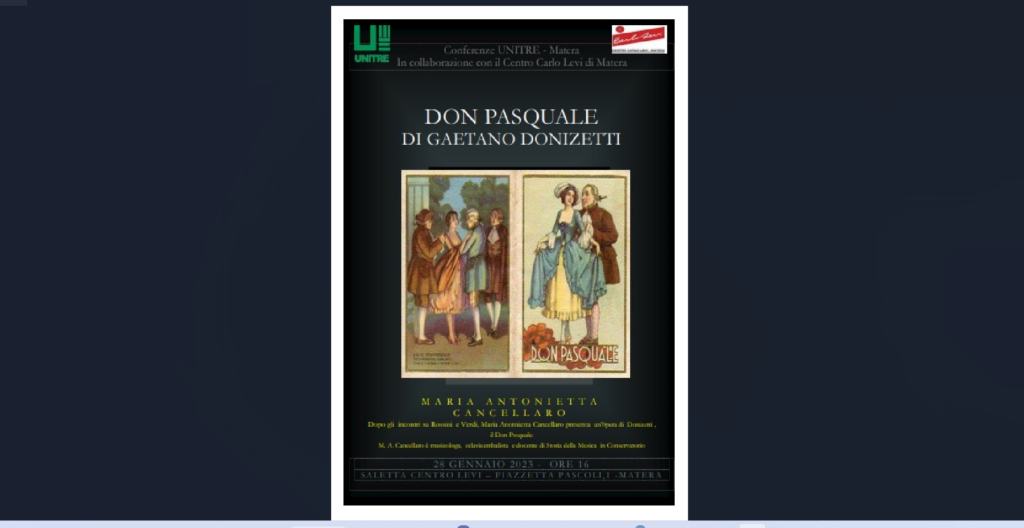 Sabato 28 gennaio, alle ore 16.00, nella saletta del Centro Carlo Levi a Matera, si terrà il primo incontro del 2023 del ciclo “Raccontare l’Opera” che sarà dedicato al Don Pasquale di Gaetano Donizetti. L’Unitre di Matera, in collaborazione con il Centro Levi, propone, come prima Conferenza del nuovo anno, un incontro dedicato a questa opera buffa in tre atti composta da Donizetti nel 1842 e rappresentata con successo per la prima volta a Parigi nel gennaio del 1843.