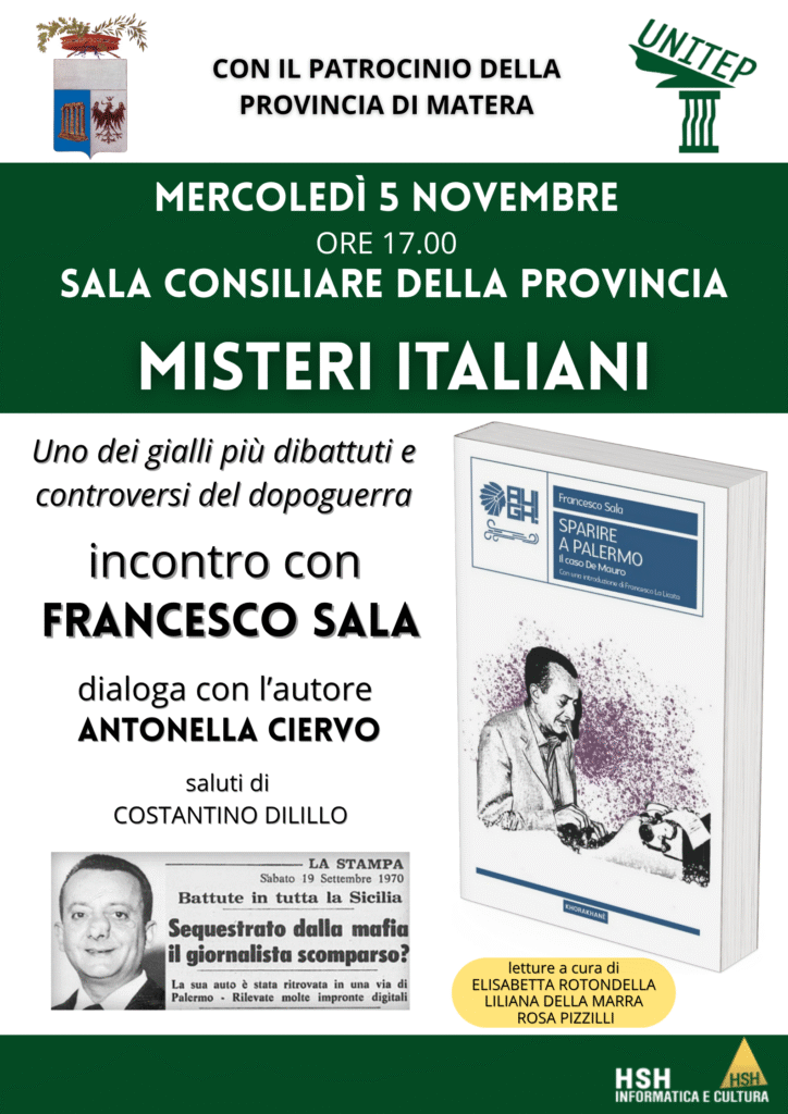 Con il Patrocinio della Provincia di Matera. mercoledì 5 novembre 2025 alle ore 17,00 nella Sala consiliare della Provincia, Unitep incontra lo scrittore e regista teatrale Francesco Sala, sul tema “Sparire a Palermo, il caso De Mauro“, intervistato da Antonella Ciervo.