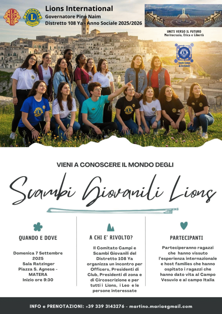Per dare una tangibile testimonianza di ciò che fa il Lions, è stato organizzato un incontro il 7 Settembre 2025 presso la sala Ratzinger in Piazza Sant’Agnese a Matera, con inizio alle ore 9:30.