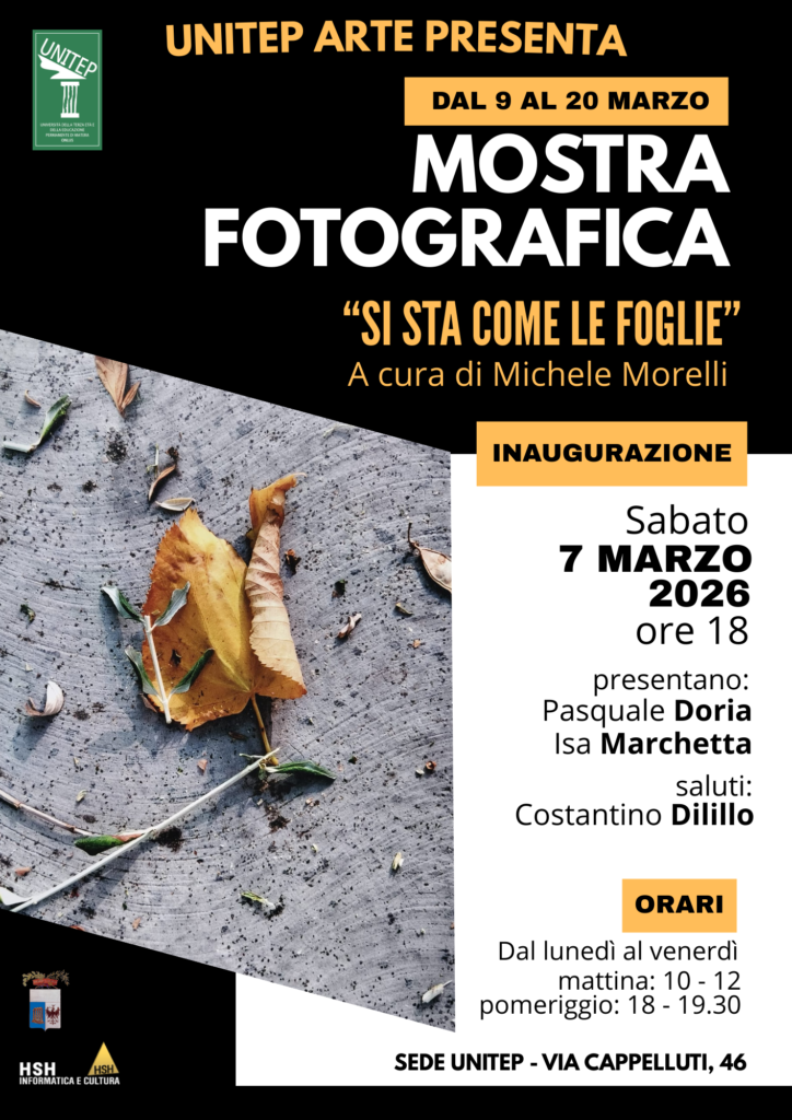Sabato 7 marzo 2026 alle ore 18, nella Sede Unitep di Matera in via Cappelluti n. 46, si svolgerà l’inaugurazione della mostra fotografica “Si sta come le foglie” di Michele Morelli.