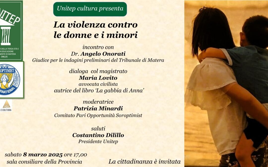 Sabato 8 marzo 2025 alle ore 17,00 nella Sala Consiliare della Provincia di Matera è in programma l’incontro con il Dr. Angelo Onorati sul tema “La violenza contro le donne e i minori” organizzato da Unitep Cultura nell’ambito delle iniziative culturali per la promozione della vita intellettuale, sociale, scientifica del territorio.