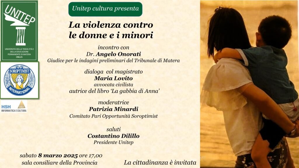Sabato 8 marzo 2025 alle ore 17,00 nella Sala Consiliare della Provincia di Matera è in programma l’incontro con il Dr. Angelo Onorati sul tema “La violenza contro le donne e i minori” organizzato da Unitep Cultura nell’ambito delle iniziative culturali per la promozione della vita intellettuale, sociale, scientifica del territorio.