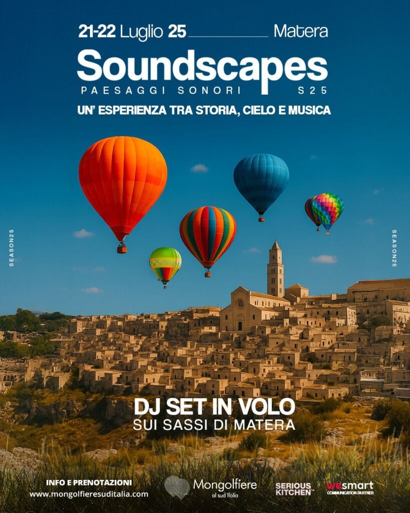 L’evento si terrà nelle giornate del 21 e 22 luglio e porterà in volo un DJ set all’interno di una mongolfiera che sorvolerà i cieli di uno dei paesaggi più iconici d’Italia. I partecipanti potranno vivere la Città dei Sassi da una prospettiva completamente inedita, immersi in un paesaggio sonoro curato da DJ internazionali in perfetta sintonia con l’atmosfera sospesa e suggestiva del territorio.