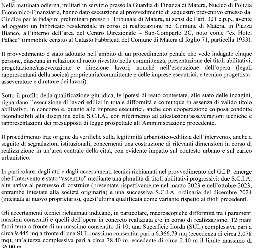 Matera, sequestrato dalla Guardia di Finanza un edificio di 12 piani realizzato abusivamente in piazza Bianco. Indagate in concorso cinque persone per i reati di abuso edilizio e false attestazioni