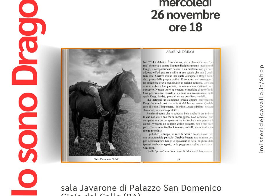 Io sono Drago è la biografia di Giuseppe Colapinto, responsabile del Centro Equestre DG Arabian Stable di Gioia del Colle (BA), referente Puglia Sef Italia per la doma in libertà, allievo dell’Accademia Gala d’oro di Verona, protagonista dello spettacolo Arabian Dream, addestratore di cavalli, mule trainer e liberty freestyle. La sua crescita, umana e professionale, va di pari passo con il rapporto unico e profondo con Drago, il cavallo arabo con il quale ha condiviso le esperienze più belle e significative: “Con pazienza e perseveranza, forse anche con un po’ di incoscienza – sottolinea l’autrice – Giuseppe ha realizzato insieme a Dominique, la sua compagna, il Centro Equestre DG Arabian Stable rendendolo un fiore all’occhiello di Gioia del Colle e dell’hinterland, garanzia di professionalità per quanti vogliano avvicinarsi all’equitazione, e struttura qualificata per eventi di ogni genere, Arabian Dream compreso. L’essenza più intima e autentica dei cavalli Arabi è tutta lì, in quelle esibizioni in bilico tra sogno e realtà. E poi ci sono i Murgesi, che lui addestra a Masseria Galeone nel Reparto Carabinieri Biodiversità di Martina Franca (Taranto), un’altra indole rispetto agli Arabi ma, quando si fanno veri e propri incantesimi, non ci sono razze ingestibili”.