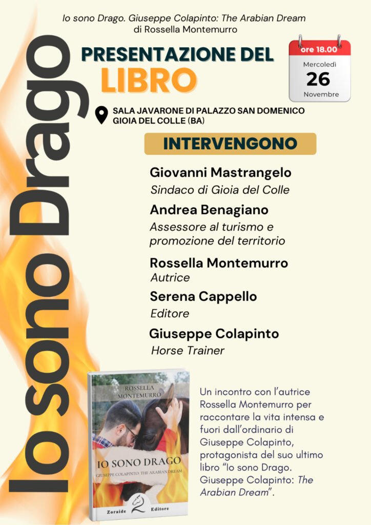Sarà presentato mercoledì 26 novembre alle 18 a Gioia del Colle (BA) nella sala Javarone di Palazzo San Domenico (via Daniele Manin, 2) Io sono Drago. Giuseppe Colapinto: the Arabian Dream (Zoraide Editore) della giornalista e scrittrice materana Rossella Montemurro. Insieme all’autrice interverranno il sindaco di Gioia del Colle Giovanni Mastrangelo, l’assessore al Turismo e promozione del territorio Andrea Benagiano, l’editrice Serena Cappello e l’horse trainer Giuseppe Colapinto.