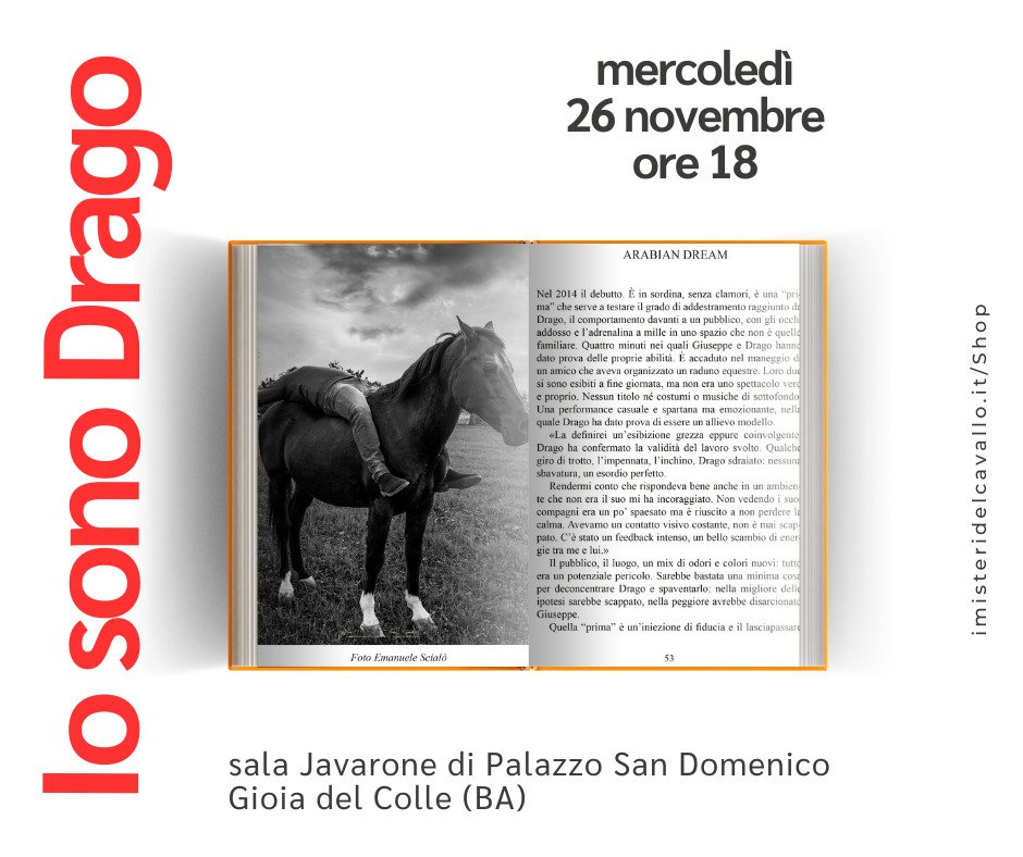 Io sono Drago è la biografia di Giuseppe Colapinto, responsabile del Centro Equestre DG Arabian Stable di Gioia del Colle (BA), referente Puglia Sef Italia per la doma in libertà, allievo dell’Accademia Gala d’oro di Verona, protagonista dello spettacolo Arabian Dream, addestratore di cavalli, mule trainer e liberty freestyle. La sua crescita, umana e professionale, va di pari passo con il rapporto unico e profondo con Drago, il cavallo arabo con il quale ha condiviso le esperienze più belle e significative: “Con pazienza e perseveranza, forse anche con un po’ di incoscienza – sottolinea l’autrice – Giuseppe ha realizzato insieme a Dominique, la sua compagna, il Centro Equestre DG Arabian Stable rendendolo un fiore all’occhiello di Gioia del Colle e dell’hinterland, garanzia di professionalità per quanti vogliano avvicinarsi all’equitazione, e struttura qualificata per eventi di ogni genere, Arabian Dream compreso. L’essenza più intima e autentica dei cavalli Arabi è tutta lì, in quelle esibizioni in bilico tra sogno e realtà. E poi ci sono i Murgesi, che lui addestra a Masseria Galeone nel Reparto Carabinieri Biodiversità di Martina Franca (Taranto), un’altra indole rispetto agli Arabi ma, quando si fanno veri e propri incantesimi, non ci sono razze ingestibili”.