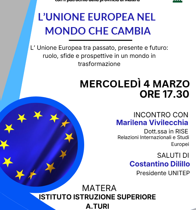 Mercoledì 4 marzo 2026 alle ore 17.00 nell’Aula Magna dell’Istituto Alberghiero Turi di Matera è in programma l’incontro sul tema “L’Unione Europea nel Mondo che cambia” con la dottoressa Marilena Vivilecchia, nell’ambito dei Mercoledì di Unitep Cultura, attività di partecipazione alla vita intellettuale, sociale, scientifica del territorio che consistono in incontri di natura formativa e informativa, con il mondo del sapere.