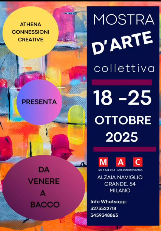 Athena Connessioni creative promuove dal 18 al 25 ottobre la Mostra d’arte collettiva “Da Venere a Bacco” al MAC – Miradoli Arte Contemporanea (Alzaia Naviglio Grande 54) a Milano.