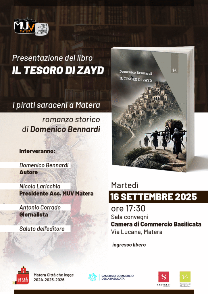 Martedì 16 settembre alle ore 17:30, presso la Camera di Commercio di Matera in via Lucana, Domenico Bennardi presenterà il suo nuovo romanzo storico-d’avventura “Il tesoro di Zayd”, edito dal Gruppo Santelli.