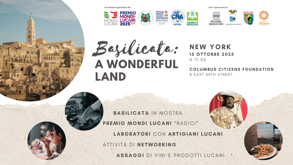 New York, 13 ottobre 2025 – La Basilicata torna a raccontarsi nella Grande Mela. Il prossimo 15 ottobre alle ore 17:00, la prestigiosa Columbus Citizens Foundation di New York ospiterà l’evento “Basilicata: a Wonderful Land”, accompagnato dalla cerimonia del Premio Mondi Lucani – Sezione Radici 2025.