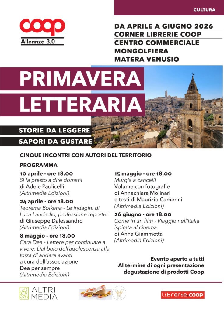 L’iniziativa propone cinque incontri dedicati alla narrativa, alla fotografia, al racconto del territorio e ai temi sociali, con protagonisti autori e realtà culturali lucane. Un percorso pensato per valorizzare la lettura come esperienza di condivisione e dialogo, in uno spazio aperto al pubblico e capace di avvicinare i lettori ai protagonisti del panorama editoriale locale. Al termine di ogni appuntamento è prevista una degustazione di prodotti Coop.