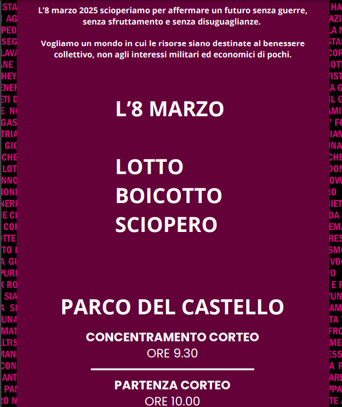 “L’8marzo 2025 scioperiamo per affermare un futuro senza guerre, senza sfruttamento e senza disuguaglianze. Vogliamo un mondo in cui le risorse siano destinate al benessere collettivo, non agli interessi militari ed economici di pochi.