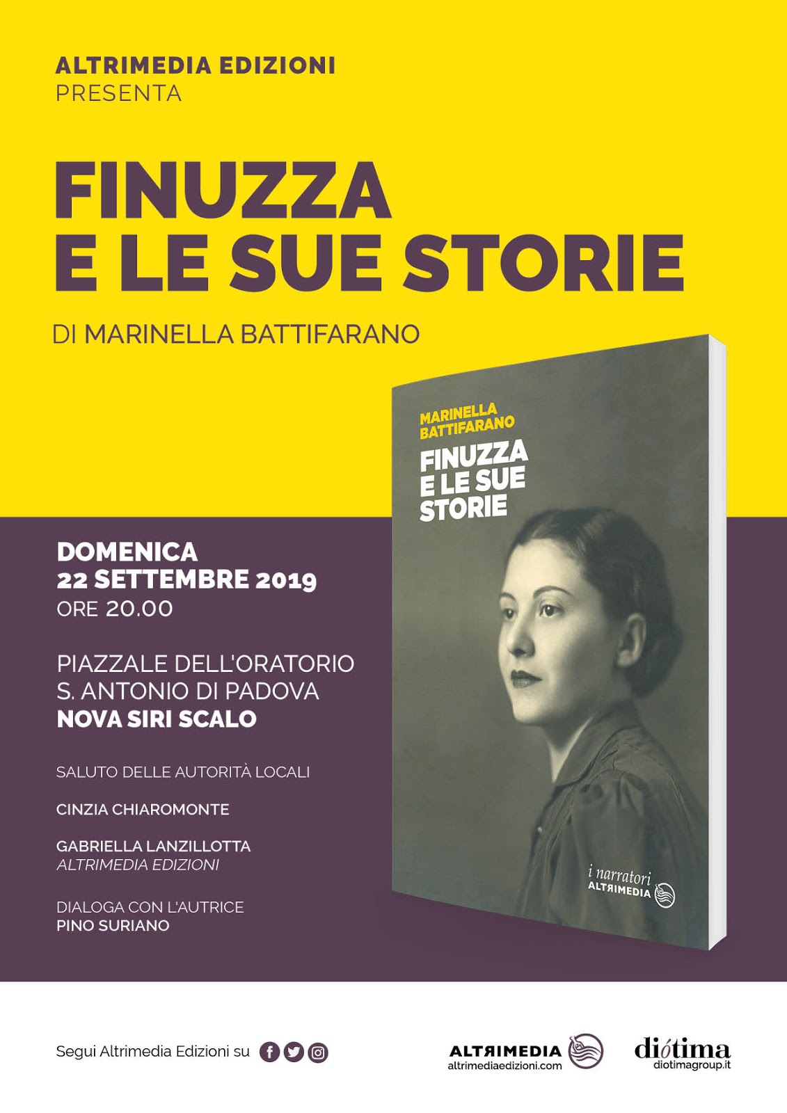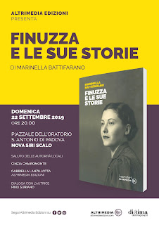 Sarà presentato il 22 settembre alle 20 a Nova Siri Scalo nel piazzale dell’oratorio Sant’Antonio di Padova Finuzza e le sue storie (Altrimedia Edizioni) di Marinella Battifarano. Dopo i saluti delle autorità locali, di Cinzia Chiaromonte e dell’editrice Gabriella Lanzillotta, il giornalista Pino Suriano dialogherà con l’autrice.