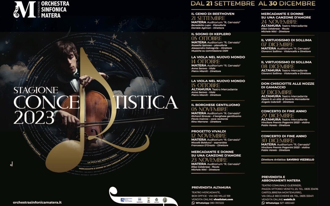 La stagione concertistica sarà illustrata nel dettaglio nel corso di una conferenza stampa lunedì 11 settembre 2023 nella Sala Rota del Conservatorio di Musica Egidio Romualdo Duni in via Duomo n.2 a Matera, con inizio alle ore 9:45.