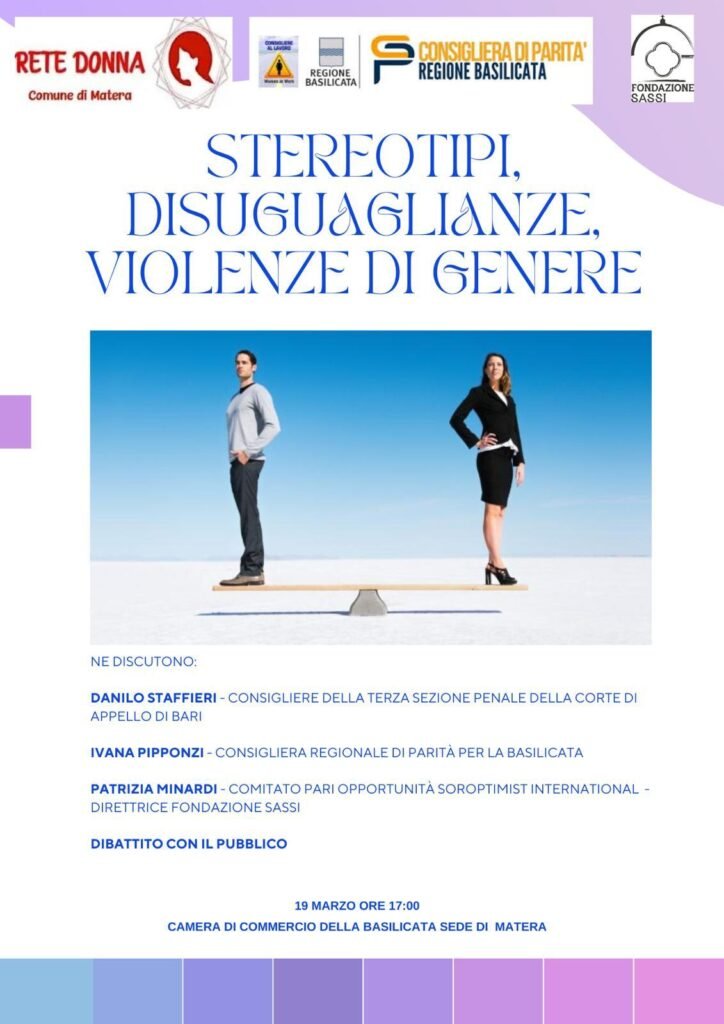 L’incontro intende analizzare il gender gap da una prospettiva giuridica e sociale, con il contributo di Danilo Staffieri, consigliere della Terza Sezione Penale della Corte d’Appello di Bari, Ivana Pipponzi, consigliera regionale di Parità della Basilicata, e Patrizia Minardi, componente del Comitato Pari Opportunità Soroptimist International e direttrice della Fondazione Sassi. Nel corso dell’appuntamento sarà presentato anche il volumetto “Pillole di Po”, raccolta di riflessioni dedicate ai temi della dignità, della giustizia e dell’uguaglianza.