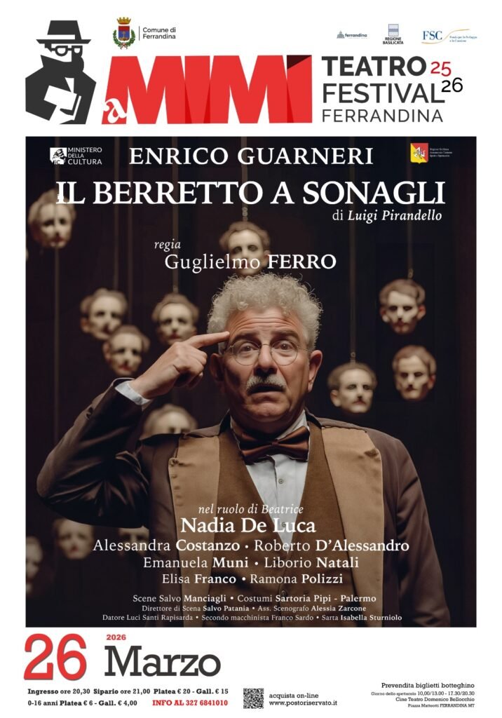 Giovedì 26 marzo la stagione del Teatro Festival Ferrandina – A Mimì prosegue con uno dei titoli più emblematici del teatro pirandelliano: Il berretto a sonagli. Protagonista l’istrionico Enrico Guarneri nel ruolo di Ciampa, affiancato dalla sensibile interpretazione di Nadia De Luca, per la regia di Guglielmo Ferro.