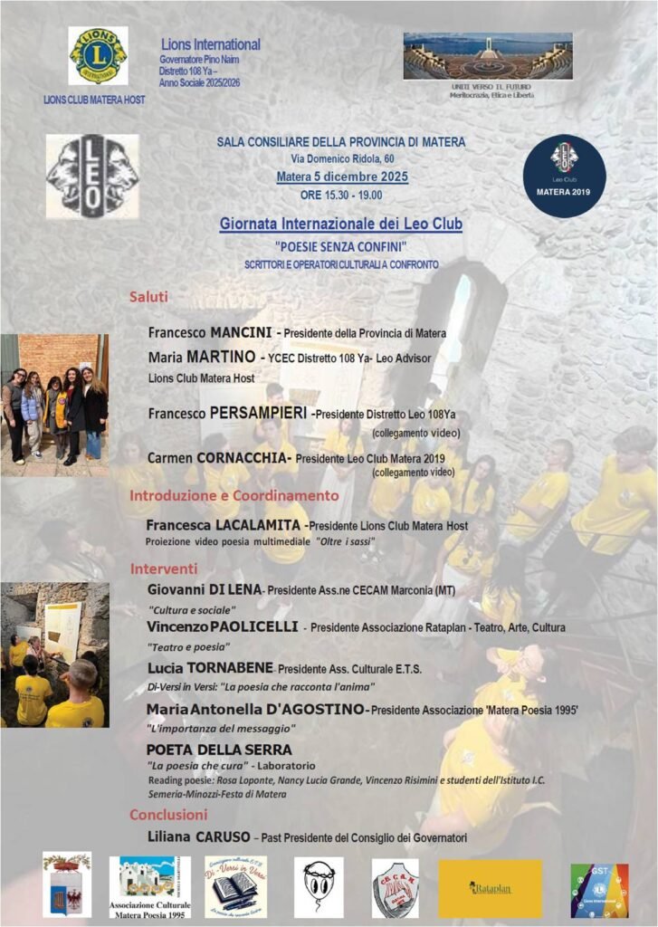 L’incontro, dal titolo “Poesie senza confini”, vedrà scrittori e operatori culturali a confronto. Dopo i saluti istituzionali da parte del Presidente della Provincia di Matera Francesco Mancini, seguiranno quelli di Maria Martino, Youth Camp & Exchange Chairperson (Ycec) e Leo Advisor per il Lions Club Matera Host, e in collegamento video di Francesco Persampieri, Presidente del Distretto Leo 108 Ya, e di Carmen Cornacchia, Presidente del Leo Club Matera 2019.